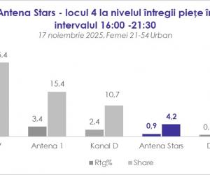 În intervalul 16:00-21:30, Antena Stars a reușit să își mențină poziția în top, obținând o medie remarcabilă de 0.9 puncte de ratingși un market share de 4.2%, performanță care confirmă ritmul ascendent al postului în preferințele publicului.