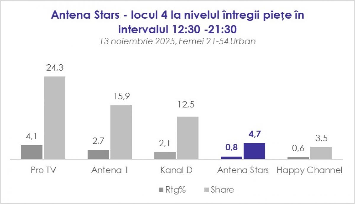 În cursul zilei de ieri, 13 noiembrie, în intervalul orar 12:30-21:30, postul a ocupat locul 4 la nivel național, înregistrând o cotă de piață de 4.7 și un rating mediu de 0.8 puncte. Rezultatele confirmă încă o dată fidelitatea publicului și interesul constant pentru programele postului.