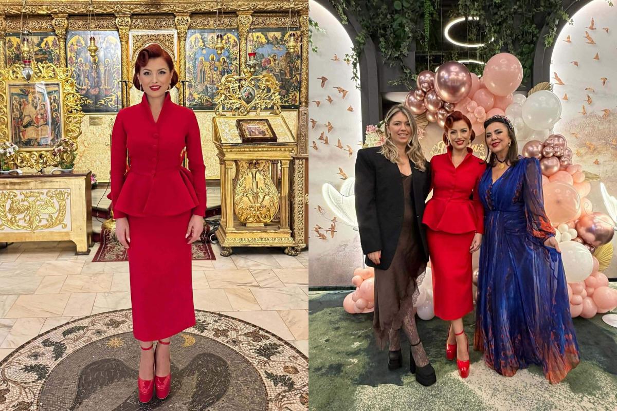 Ținutele nașilor au completat atmosfera elegantă a evenimentului. Elena Gheorghe a purtat un compleu roșu spectaculos — o cămașă cu volane și o rochie lungă, mulată, care i-a pus în valoare silueta. Părul prins într-un coc și rujul roșu au adăugat un plus de rafinament look-ului. Cornel Ene a ales o ținută all black, formată din sacou, cămașă și pantaloni eleganți, potrivindu-se perfect cu tonul festiv al evenimentului.
